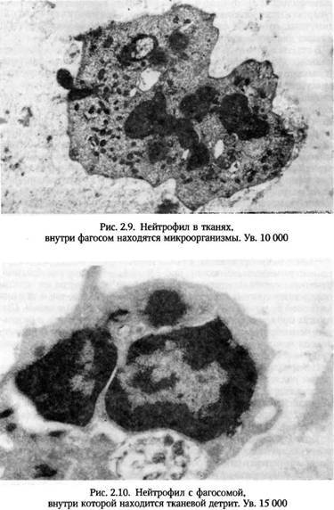 Проникнув в очаг В., фагоциты выполняют свою главную фагоцитарную функцию. Фагоцитоз – эволюционно выработанная защитно-приспособительная реакция организма, заключающаяся в узнавании, активном захвате (поглощении) и переваривании микроорганизмов, разрушенных клеток и инородных частиц специализированными клетками – фагоцитами. К ним относятся полиморфно-ядерные лейкоциты (в основном нейтрофилы), клетки системы фагоцититрующих мононуклеаров (моноциты, тканевые макрофаги), а также клетки Купфера в печени, мезангиальные клетки почек, глиальные клетки в ЦНС и др.