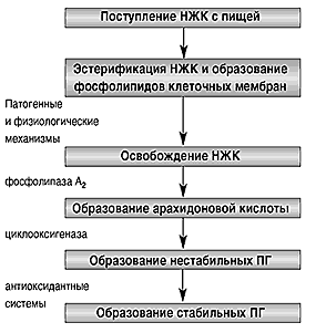 Источником для образования ПГ являются ненасыщенные жирные кислоты (НЖК), которые поступают в организм с пищей и в фосфорилированном виде входят в структуру мембран клеток. При нарушении структуры клеточных мембран из НЖК под воздействием фосфолипазы А2 образуется арахидоновая кислота. К увеличению содержания свободных НЖК приводят различные патогенные воздействия, вызывающие разрушение клеточных мембран. В физиологических условиях выходу НЖК способствуют катехоламины, брадикинин, ангиотензин II и другие факторы, активизирующие фосфолипазы. Под воздействием фермента циклооксигеназы из арахидоновой кислоты образуются первичные эндоперекиси (нестабильные простагландины). В последующем под влиянием антиокислительных систем клеток к кислороду присоединяется водород с образованием гидроксилов в кольце и боковых цепях и формируется молекула стабильных ПГ. Простагландины быстро метаболизируются во всех тканях, особенно в легких, печени, почках, селезенке. Схематично процесс образования ПГ изображен на рис. 2.