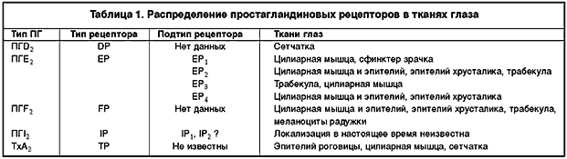 Классификация простагландиновых рецепторов и их распределение в тканях глаза представлены в табл. 1.