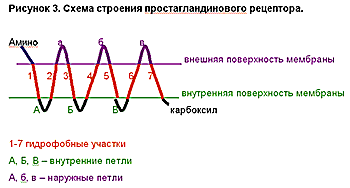 В настоящее время практически расшифрована структура некоторых простагландиновых рецепторов. Существование классов простагландиновых рецепторов обусловлено различным аминокислотным составом белковой молекулы. Однако их расположение в клеточной мембране сходно (рис. 3.). Они состоят из семи гидрофобных сегментов, которые погружены в клеточную мембрану. Молекула белка, образующего рецептор, имеет три петли, которые находятся на наружной поверхности клеточной мембраны, и три петли на внутренней поверхности мембраны. Один конец белковой молекулы, содержащий аминогруппу, находится на поверхности клетки, а другой конец, содержащий карбоксильную группу, находится во внутриклеточном пространстве.