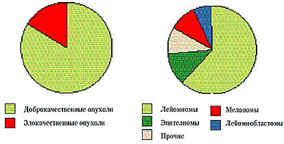 Рис. 1а. Частота доброкачественных и злокачественных опухолей иридоцилиарной зоны.