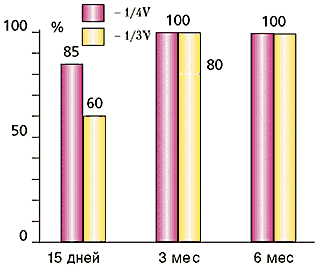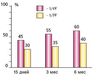Рис. 5. Частота восстановления остроты зрения в зависимости от размера иссечения радужки и от сроков наблюдения у больных c иридопластикой.