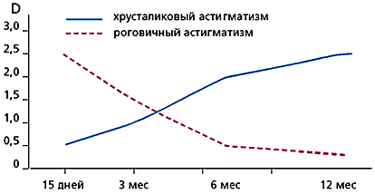 Причиной ухудшения зрения является не только сформированная полная колобома радужки, но и развивающийся в послеоперационном периоде роговичный и хрусталиковый астигматизм. При условии, что во всех случаях мы использовали клапанный склеральный разрез, роговичный астигматизм был отмечен у 40% больных. Процесс этот оказался динамичным: частота и степень его зависели от локализации операционного разреза и послеоперационных сроков. Чем ближе к лимбу производится разрез, тем чаще (60%) развивается гиперметропический астигматизм, степень которого составляла в среднем 2,5 Д. Как показали дальнейшие наблюдения за больными в динамике, в течение 6 месяцев имело место уменьшение астигматизма до 0,5 Д.