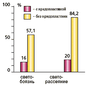 Светорассеяние относится к группе сферических аберраций и определяется разностью между степенью преломления лучей, проходящих через центр и периферию зрачка. Отсутствие единого фокуса приводит к появлению кругов светорассеяния. Степень его зависит от величины колобомы. По нашим наблюдениям, при удалении 1/3 окружности радужки светорассеяние возникает у 60% больных, и в 21% случаев – при удалении ее четверти. Светобоязнь возникает позже, чем светорассеяние, что можно объяснить ответной реакцией глаза на постоянное и мощное раздражение нервных рецепторов сетчатки. Встречается она у 57% оперированных больных.