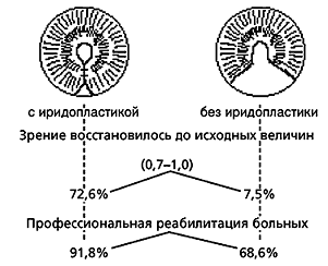 Оказалось, что при одинаковом исходном состоянии зрительных функций использование иридопластики позволило добиться значительного улучшения остроты зрения после операции с полным его восстановлением до исходного уровня (рис. 5).