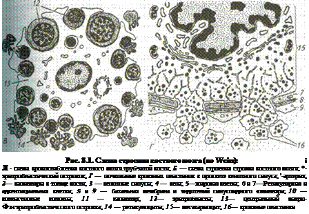 Среди гемопоэтических клеток красного костного мозга выделяют: стволовые и полустволовые клетки, морфологически сходные с малыми лимфоцитами и трудно идентифицируемые обычными гистологическими методами; властные формы (проэритробласты, промиело-циты, метамиелоциты, пролимфоциты, промоноциты, мегакари-областы, мегакариоциты); дифференцирующиеся и зрелые форменные элементы крови. Соотношение зрелых и незрелых форм в красном костном мозге и в периферической крови служит важным диагностическим показателем нормы или патологии. В норме в кровоток из красного костного мозга попадают только зрелые форменные элементы крови и некоторое количество клеток, мигрирующих в другие органы, например, в лимфоидные.