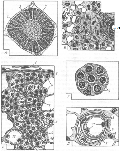 А — общий вид долек; Б — кора; Я — мозговое вещество; Г— клетка-нянька из наружной части коры; Д— строение гемато-тимического барьера; / — капсула; 2— кора; 3 — мозговое вещество; 4— фибробласт; 5— базальная мембрана; 6—эпителиальная строма; 7—десмосомы между эпителиальными клетками; 8— макрофаг; 9— лимфоцит; 10— лимфобласт в процессе митоза; // — интердигитирующая клетка; 12—просвет сосуда; 13—миоидная клетка; 14—центр ороговения тельца Гассаля; /5— клетка эндотелия