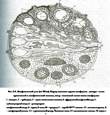 Капсула (capsula). Она построена из плотной соединительной ткани; в сторону ворот (hilus) от нее отходят трабекулы (trabeculae), фор" мирующие остов органа. Капсула часто связана с жировой клетчаткой, окружающей орган. В трабекулах обнаруживают пучки ретикулярных, коллагеновых, нервных волокон, гладкомышечные клетки, кровеносные сосуды. Сокращение гладких миоцитов способствует прохожие* нию лимфы через узел.