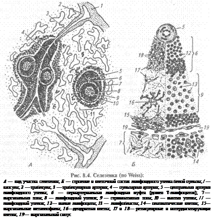 Вместе с селезеночной артерией через ворота в паренхиму селезенки вступают нервные стволики. В их составе различают миелиновые и безмиелиновые нервные волокна. Первые принадлежат нейронам чувствительных ганглиев, терминальные веточки которых образуют свободные нервные окончания в капсуле, трабекулах, на стенках тра-бекулярных артерий и вен, вблизи синусоидов. Безмиелиновые волокна представлены постганглионарными симпатическими и парасимпатическими эфферентными аксонами, обеспечивающими нейротрофи-ческий и регуляторный контроль микроциркуляторного русла селезенки.