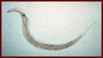 Аскарида – круглый червь, паразит человека и некоторых животных. Это крупные паразиты, веретенообразной формы. Длина тела самки достигает 24-40 см, самца – 15-25 см. обитает в тонких кишках. Самка откладывает в кишках свыше 200 000 яиц. Яйца в кишечнике не развиваются, а выводятся вместе с калом наружу и только во внешней среде созревают до инвазионной стадии. Из созревшего яйца, попавшего с пищей или питьем в кишечник человека, выходит личинка, которая пробуравливает стенку кишок, попадает в кишечные вены, достигает с венозной кровью сердца и оттуда током крови заносятся в легкие. Здесь она пробуравливает легочные альвеолы и, двигаясь вверх по дыхательным путям, достигает ротовой полости. Только после этого, будучи проглочена со слюной и вторично попав в тонкий кишечник, личинка превращается во взрослую аскариду. Живут в кишечнике около года, число их колеблется от одного до нескольких сотен экземпляров.
