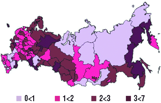 С 1962 года в ряде стран Европы и Азии, Канаде и США, а с 1968 года – и в нашей стране отмечается подъем заболеваемости МИ. Данные анализа глобальной эпидобстановки в 2005 году свидетельствуют о том, что в странах субсахарной Африки показатели заболеваемости МИ в целом колеблются от 100 до 800 случаев на 100 тыс. населения, а летальности – до 14%; предоминирует серогруппа менингококка А. На Европейском континенте наиболее высокий уровень заболеваемости МИ регистрировался в Исландии и Ирландии – 5–6,6 случаев на 100 тыс. населения, где предоминирует серогруппа В. А в странах Океании (Новая Зеландия) показатель заболеваемости МИ составил в этот период 14,5 случаев на 100 тыс. населения. В России с 1999 года в Астраханской, Пермской, Челябинской, Кемеровской, Новосибирской, Омской областях, в Хабаровском крае произошел значительный прирост МИ – на 22–40% – и составил 8,2 случая на 100 тыс. населения. В целом в 40 регионах страны в последние годы наблюдается снижение показателей заболеваемости этой инфекцией (рис. 1) [2, 3]. В общей серогрупповой характеристике по стране преобладают менингококки серогруппы А.
