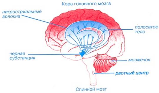 Однако важным для целостного процесса движения является контроль не только за произвольными, но и за непроизвольными движениями. Эту функцию выполняет ЭКСТРАПИРАМИДНАЯ СИСТЕМА обеспечивающая плавность движений и возможность прервать начатое действие. Эта система объединяет структуры-базальные ганглии, располагающиеся за пределами продолговатого мозга (отсюда термин "экстрапирамидная система"). Нейротрансмиттер, обеспечивающий бессознательный контроль за движениями, получил название "дофамин". В основе БП лежит дегенерация дофаминергических нейронов - нейронов, вырабатывающих и накапливающих дофамин.