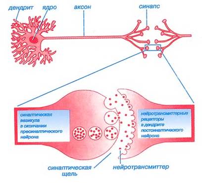 Дофамин вырабатывается и накапливается в пузырьках (везикулах) пресинаптического нейрона и затем под воздействием нервного импульса высвобождается в синаптическую щель. В синаптической щели он связывается с дофаминовыми рецепторами, располагающимися в постсинаптической мембране нейрона, в результате чего обеспечивается дальнейшее прохождение нервного импульса через постсинаптический нейрон.