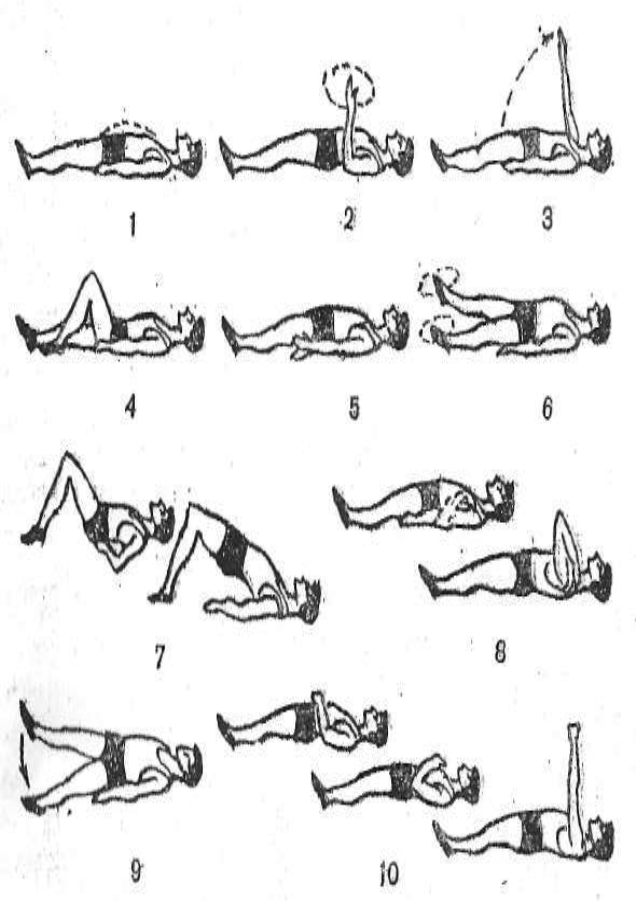 Исходное положение (ИП) —лежа на постели на спине, руки вдоль туловища.