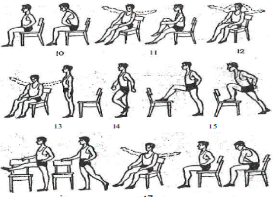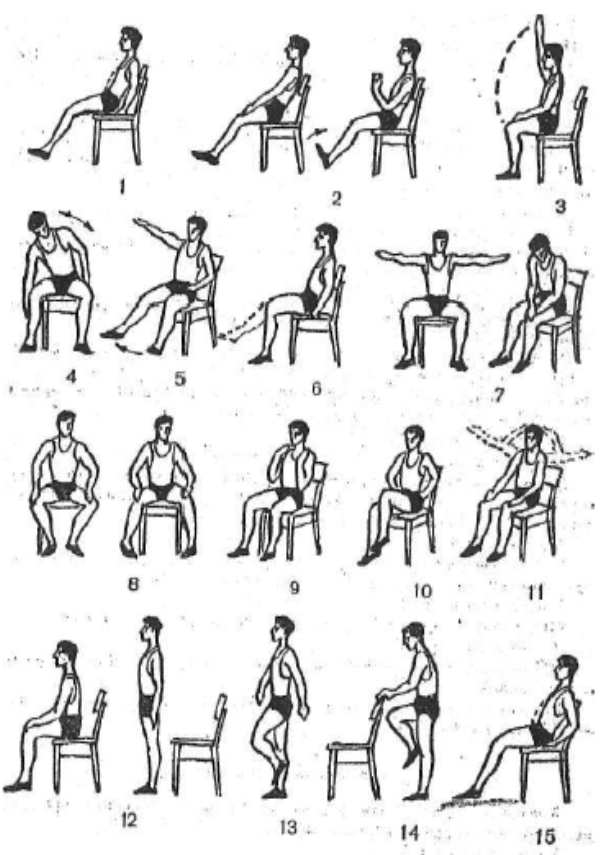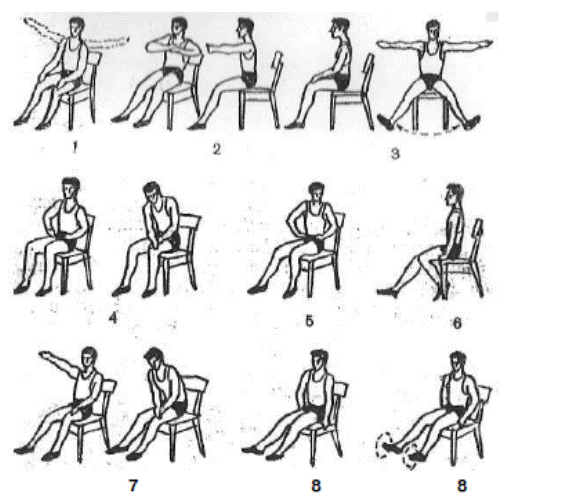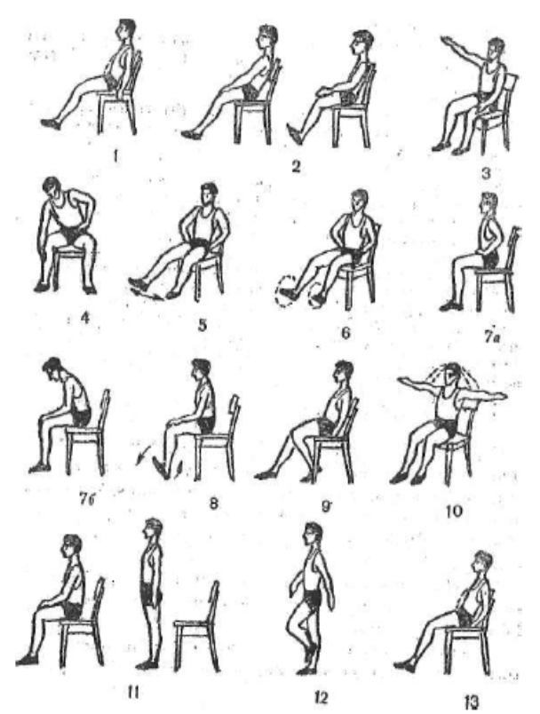 ИП — сидя на стуле, ноги, вытянуты, руки сбоку стула.