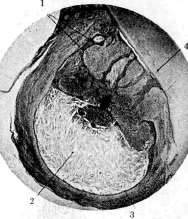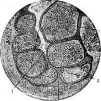 Рисунок 1. Эпителиальная гранулема: 1 расщепление эпителиального тяжа и образование щелевидной полости: 2 тяжи эпителиальной ткани; 3 островки грануляционной ткани.
