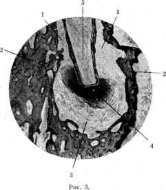 Рисунок 3. Зубная гранулема in situ (трупный материал): 1 перицемент; 2 костные стенки альвеолы; 3 -фиброзная капсула гранулемы, переходящая в перицемент (вследствие наличия гранулемы и рассасывания костной ткани в области дна альвеолы в периапикальном губчатом костном веществе образовалось лишенное костных балок пространство, выполненное тканью гранулемы); 4 -гранулема; 5- корень зуба.