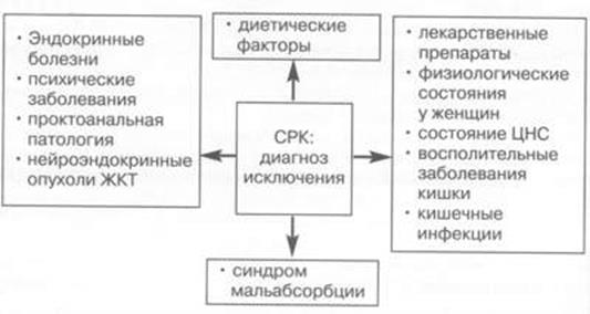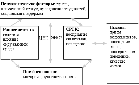 СРК является биопсихосоциальным расстройством, в основе развития которого лежит взаимодействие 2-х основных патологических механизмов: психосоциального воздействия и сенсорно-моторной дисфункции, т.е. нарушения висцеральной чувствительности и двигательной активности кишечника. Третий фактор – нейроиммунные повреждения в результате инфекционных заболеваний кишечника (возможная причина сенсорно-моторной дисфункции).