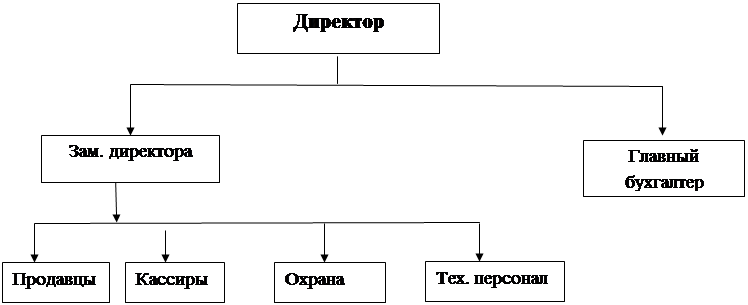 Директор самостоятельно решает все вопросы деятельности предприятия, за исключением отнесенных законодательством к компетенции общего собрания трудового коллектива. Директор действует от имени предприятия, представляет его интересы на всех предприятиях, в учреждениях и организациях, распоряжается его имуществом в пределах прав, установленных учредителями, заключает договора, в том числе трудовые, выдает доверенности, открывает в банках расчетные и другие счета, пользуется правом распоряжения средствами, утверждает структуру и штаты исполнительного аппарата управления, издает приказы и дает указания, обязательные для исполнения всеми работниками. Штат персонала предприятия составляют 10 человек плюс руководство – директор, заместитель директора, старший продавец и бухгалтер. Организационная структура представлена линейно. Всеми решающими вопросами занимается руководитель, включая планирование закупок товаров. Финансовыми расчетами занимается бухгалтер предприятия, по результатам деятельности которого (финансовые отчеты), руководитель принимает решения.
