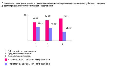 4. Соотношение грамположительной и грамотрицательной микрофлоры зависит от степени тяжести сахарного диабета – грамотрицательная микрофлора начинает преобладать при увеличении степени тяжести заболевания.