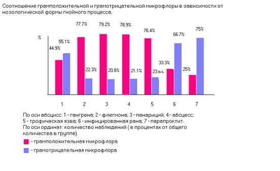 У больных встречались 7 основных форм гнойно-некротического процесса: гангрена, флегмона, панариций, абсцесс, трофическая язва, гнойная рана, парапроктит (рис.3.). При таких нозологических формах как флегмона, панариций, абсцесс, трофическая язва из патологического очага высевается, в основном, грамположительная микрофлора, в то время как при гангрене, гнойной ране и парапроктите явно преобладают грамотрицательные микроорганизмы.