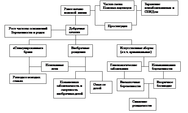 Вступление неподготовленных в области гигиены половой жизни подростков в интимнее отношения часто влечет за собой многие негативные медико-социальные последствия, как для них самих, так и для их семей, а также для общества в целом (см. схема №1). Прежде всего, имеются в виду увеличение числа венерических заболеваний среди молодежи, наступление нежелательных беременностей, проблемы юных матерей-одиночек.