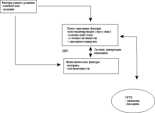 Современные этиопатогенетические концепции СРТК основаны на взаимодействии генетически и психогенно обусловленных (т.е. связанных с психотравмирующими воздействиями) патофизиологических, психопатологических и личностных расстройств. В качестве иллюстрации можно привести биопсихосоциальную схему СРТК, представленную в одной из последних работ D. Drossman и соавт., 1999 (см. рисунок).
