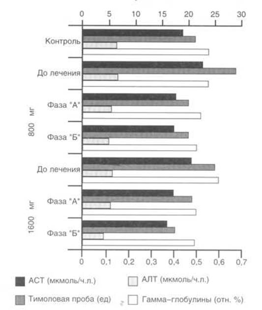 Антидепрессивный эффект гептрала позволял назначать эти препараты в меньших дозах. Осложнений при применении гептрала не отмечалось. У всех больных выявили тенденцию к снижению показателей (см. рисунок) активности цитолитического синдрома, тимоловой пробы, а также содержания гамма-глобулинов в сыворотке крови (p < 0,05).