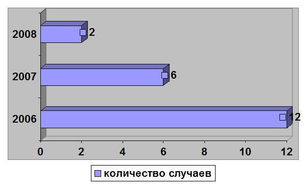 Количество больных , состоящих на диспансерном учете с заболеваниями кожи примерно на одинаковом уровне по всем нозологиям кроме псориаза, который увеличился с 40 случаев в 2006г до 50 за 9 мес 2009г, что можно объяснить лучшей выявляемостью заболевания при проведении медосмотров, и лучшей информированностью населения об этом заболевании, что служит поводом для обращения за медицинской помощью.
