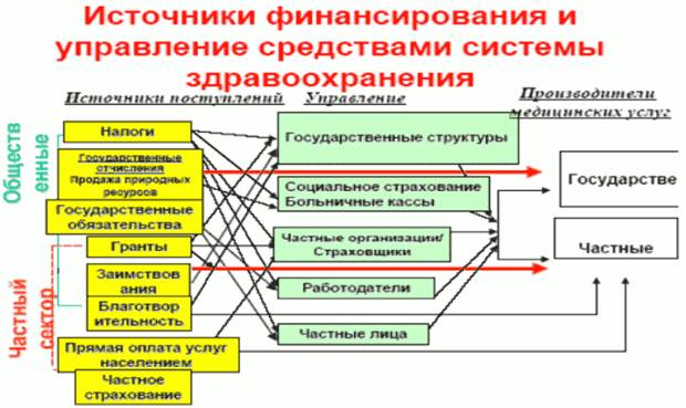 Существуют страны с преимущественным финансированием из налоговых поступлений, опирающиеся на финансирование из фондов медицинского страхования, а также страны, где используются преимущественно платежи наличными. Важно то, что во всех странах здравоохранение берет необходимые ресурсы из всех источников, и проблемы возникают тогда, когда происходят внутренние сдвиги внутри конкретной системы здравоохранения, связанные с изменениями в системе, например, уменьшения доли налогового финансирования.