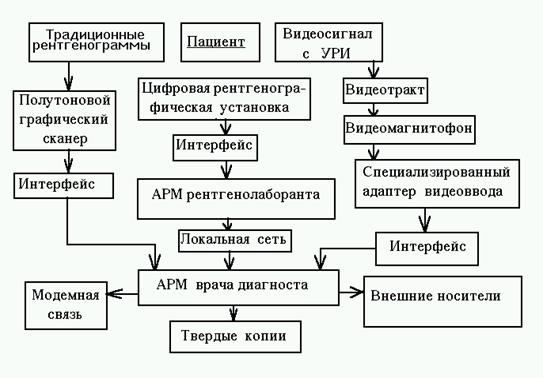 На рис.5 изображена принципиальная схема взаимодействия элементов системы получения, обработки, хранения и передачи рентгеновских диагностических изображений.