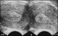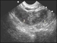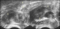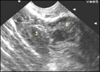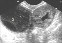 Обнаружение патологического образования в проекции придатков является наиболее точным из всех косвенных признаков. Данное образование представляет собой трубу с плодовместилещем. В тех случаях, когда имеется прогрессирующая трубная беременность малого срока, в просвете маточной трубы определяется полость амниона округло-овальной формы, внутри которой можно визуализировать желточный мешок в виде кольцевидной структуры. Особенностью визуализации плодного яйца в маточной трубе является хорошо определяемый хорион, который окружает полость амниона по периферии в виде ткани солидной структуры. Такая отчетливая визуализация хориона объясняется разной эхогенностью тканей. Если в полости матки трофобласт и эндометрий имеют одинаковые эхографические характеристики, то в просвете трубы, где слизистая очень тонкая, хорион хорошо определяется как зона повышенной эхогенности на гипоэхогенном фоне мышечного слоя стенки. Дополнительным эхогрфическим признаком является отсутствие связи выявленного образования с маткой и яичником, для чего помогает исследование имитации двуручного исследования. Применять этот прием следует очень осторожно, помня, что при форсированных движениях возможен разрыв трубы. Более щадящим методом, однако, менее надежным является глубокий вдох и выдох пациенткой, при котором происходит смещение внутренних органов.