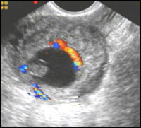 Эхографическая диагностика яичниковой беременности ранних сроков не возможна, так как плодное яйцо, желточный мешок симулируют фолликул или желтое тело. Не помогает применение цветового картирования и ДГ в связи с тем, что в сроке до 5 недель беременности область хориона аваскулярна, а гиперваскуляризация и низко-резистентный тип кровотока характерны как для трофобластического кровотока, так и для желтого тела.
