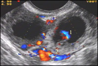 Наибольшие трудности возникают при дифференциальной диагностике нарушенной трубной беременности с тубоовариальными образованиями воспалительного генеза, так как эхографические признаки придатковых образований в этих случаях идентичные. Не помогают и данные изменений эндометрия, которые имитируют эндометрит. В этих случаях единственным ультразвуковым критерием являются статистические достоверные данные ИР, показатели которого при трубной беременности имеют средние значения 0,42±0,04, а при воспалительном процессе – 0,64±0,04.