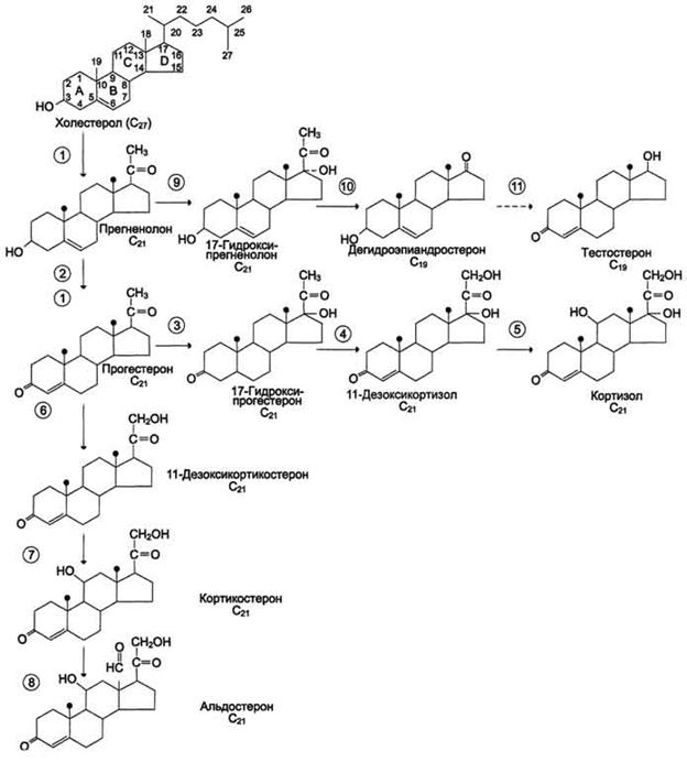 Биосинтез андрогенов осуществляется главным образом в семенниках и частично в яичниках и надпочечниках. Основными источниками и предшественниками андрогенов, в частности тестостерона, являются уксусная кислота и холестерин. Существуют экспериментальные доказательства, что путь биосинтеза тестостерона от стадии холестерина включает несколько последовательных ферментативных реакций через прегненолон и 17-α-окси-прегненолон (см. ранее). Регуляция биосинтеза андрогенов в семенниках осуществляется гонадотропными гормонами гипофиза (ЛГ и ФСГ), хотя механизм их первичного эффекта до сих пор не раскрыт; в свою очередь андрогены регулируют секрецию гонадотропинов по механизму отрицательной обратной связи, блокируя соответствующие центры в гипоталамусе.