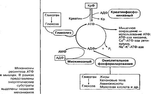 • креатинфосфокиназный (фосфогенный или алактатный) механизм, обеспечивающий ресинтез АТФ за счет перефосфорилирования между креатинфосфатом и АДФ;