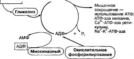 • миокиназный механизм, осуществляющий ресинтез АТФ за счет реакции перефосфорилирования между двумя молекулами АДФ с участием фермента миокиназы (аденилаткиназы).