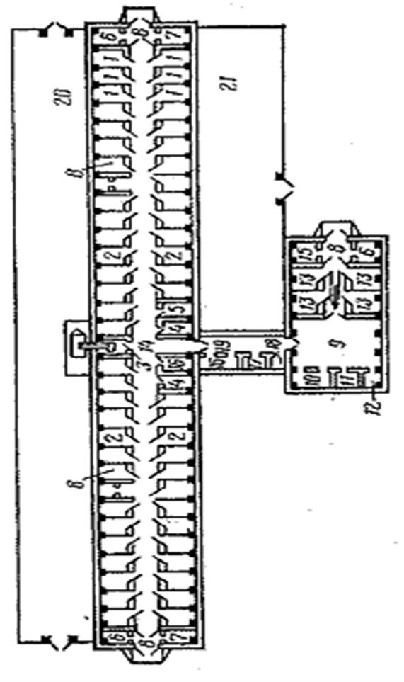 План конюшни на 50 племенных лошадей: 1 - денники для ремонтных кобыл, 2 - денники для племенных кобыл, 3 - помещение для удаления навоза, 4 - дежурная, 5-сбруйная, 6-фуражная, 7-инвентарная, 8 - тамбур, 9 - манеж, 10 - помещение для искусственного осемения и ректального обследования кобыл, 11 - помещение для апробации семени, 12 - моечная, 13 - денники для жеребцов, 14 - проход, 15 - сбруйно-инвентарная, 16 - вентиляционная камера, 17 - электрощитовая, l8 - подсобное помещение, 19 - коридор, 20 - паддок для кобыл (расстояние от стены конюшни до противоположного ограждения - 12 м), 21-паддок для жеребцов (те же расстояние - 10 м).