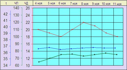 | 18.11.02. | Состояние больного удовлетворительное. Сон хороший, t=36.5 градусов Цельсия. Головные боли, одышка, головокружение прекратились. Объективно: Кожа нормального цвета выраженных отеков, цианоза губ, нет. АД 150/90 мм. рт. ст. симметрично на обеих руках, пульс твердый, симметричный, напряжен, частой 75 ударов в минуту. Аускультативно: приглушены тоны, акцент на аорте, ритм правильный. Одышки в покое нет, ЧД = 18 движений в минуту. Стул, мочеиспускание не нарушены, живот мягкий, печень под краем реберной дуги. Край печени мягкий, эластический, подвижный. |