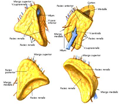 Надпочечники (glandula suprarenalis, ед. ч.)-парные железы внутренней секреции, расположенные над верхними полюсами почек. У человека они находятся на уровне XI грудного - I поясничного позвонков , забрюшинно. Правый надпочечник имеет треугольную форму , левый - полулунную; вогнутые основания надпочечников примыкают к выпуклым полюсам почек. Вместе с почками надпочечники заключены в жировую капсулу ( сapsula adiposa ) и покрыты почечной фасцией ( fascia renalis ). Длина надпочечника взрослого человека варьирует от 30 до 70 мм, ширина - от 20 до 35 мм , толщина - от 3 до 10 мм, масса обоих надпочечников составляет 10 -14 г. Снаружи надпочечник покрыт соединительнотканной капсулой, от которой в паренхиму отходят перегородки, заключающие в себе сосуды и нервы и делящие паренхиму надпочечников на группы клеток и клеточные тяжи. В надпочечниках различают наружное корковое вещество, составляющее примерно 2/3 всей массы надпочечника , и внутреннее мозговое вещество. У новорожденных масса надпочечника в среднем 3,5 г. С возрастом она увеличивается, постепенно разграничиваются корковое и мозговое вещество, отдельные зоны коркового вещества.