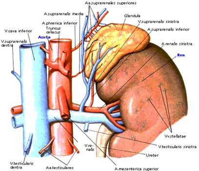 через центральную и многочисленные поверхностные вены, впадающие в венозную сеть окружающих органов и тканей. Параллельно кровеносным расположены лимфатические капилляры, отводящие лимфу. Иннервируются надпочечники симпатическими (преимущественно) и парасимпатическими волокнами чревного, блуждающего и диафрагмального нервов .