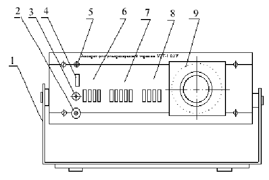 1- ручка, 2- разъём ВЫХОД для подключения кабеля излучателя, 3- индикатор выходного напряжения, 4- выключатель СЕТЬ, 5- индикатор включения сети, 6- переключатель ИЗЛУЧАТЕЛИ, 7- переключатель ИНТЕНСИВНОСТЬ, ВТ/СМ2 , 8- переключатель РЕЖИМ РАБОТЫ, 9- процедурные часы.