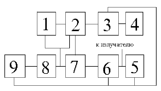 1- автогенератор, 2- модулятор, 3- буферный каскад, 4- предусилитель, 5- усилитель выходной, 6- индикатор выходного напряжения, 7- импульсный генератор, 8- блок питания, 9-процедурные часы.