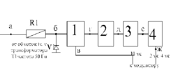 4.2.4. Модулирующие импульсы создаются в импульсном генераторе (рис.3). Модулирующие импульсы длительностью 2мс и 4мс генерируются в ждущем мультивибраторе, а длительностью 10мс формируются и синусоидального напряжения сети с помощью обострителя.