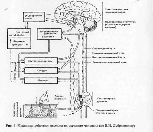 Массаж широко используется не только для лечения травм, заболеваний, но и с профилактической целью. Массаж — это совокупность механических приемов, посредством которых массажист оказывает воздействие на поверхностные ткани, и рефлекторным путем — на функциональные системы и органы (рис. 3). В отличие от физических упражнений, где главное — трениров-