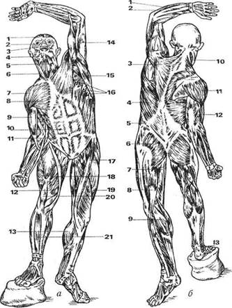 Рис. 5. Мышцы человека (по В.П. Воробьеву): а — вид спереди: 1 — лобная мышца; 2 — круговая мышца глаза; 3 — круговая мышца рта; 4 — жевательная мышца; 5 — подкожная мышца шеи; в — грудино-клю-чично-сосцевидная мышца; 7 — дельтовидная мышца; 8 — большая грудная мышца; 9 — двуглавая мышца плеча; 10 — прямая брюшная мышца; 11 — наружная косая мышца живота; 12 — внутренняя и широкая мышца; 13 ^ икроножная мышца; 14 — трехглавая мышца плеча; 15 — широчайшая мышца спины; 16 — зубчатая передняя мышца; 17 — портняжная мышца; 18 — четырехглавая мышца бедра; 19 — наружная широкая мышца; 20 — сухожилие четырехглавой мышцы бедра; 21 — передняя болынеберцовая мышца; б — вид сзади: 1 и 2 — разгибатели предплечья; 3 — трапециевидная мышца; 4 — широчайшая мышца спины; 5 — наружная косая мышца живота; 6 — большая ягодичная мышца; 7 —- полусухожильная и полуперепончатая мышца; 8 — двуглавая мышца бедра; 9 — икроножная мышца; 10 — пластырная мышца; 11 — дельтовидная мышца; 12 — трехглавая мышца плеча; 13 — ахиллово сухожилие