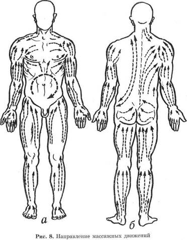 3. Разминание производится в восходящем направлении, по ходу мышечных волокон; некоторые мышцы массируют и в поперечном, и в продольном направлениях.