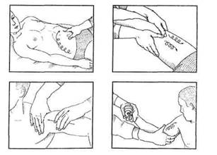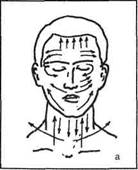 Надавливание производится прерывисто концом указательного или большого пальца (или II—Vпальцами) в местах выхода нервов (особенно спинномозговых), на мышцах лица (при парезе лицевого нерва, увядании кожи и др.).