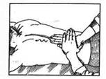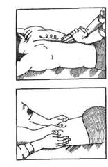 «Пересекание» области живота производится кистью одной руки при отведенном большом пальце с одной стороны и II— IIIпальцами зигзагообразно снизу вверх (от лобковой области к мечевидному отростку) — с другой.