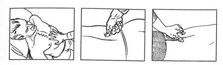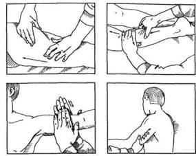 Похлопывание осуществляется ладонной поверхностью кисти (большой палец прижат) или кистью при слегка согнутых пальцах. Оно выполняется одной или двумя руками попеременно, мягко, в основном на мышцах спины, бедрах, ягодицах.